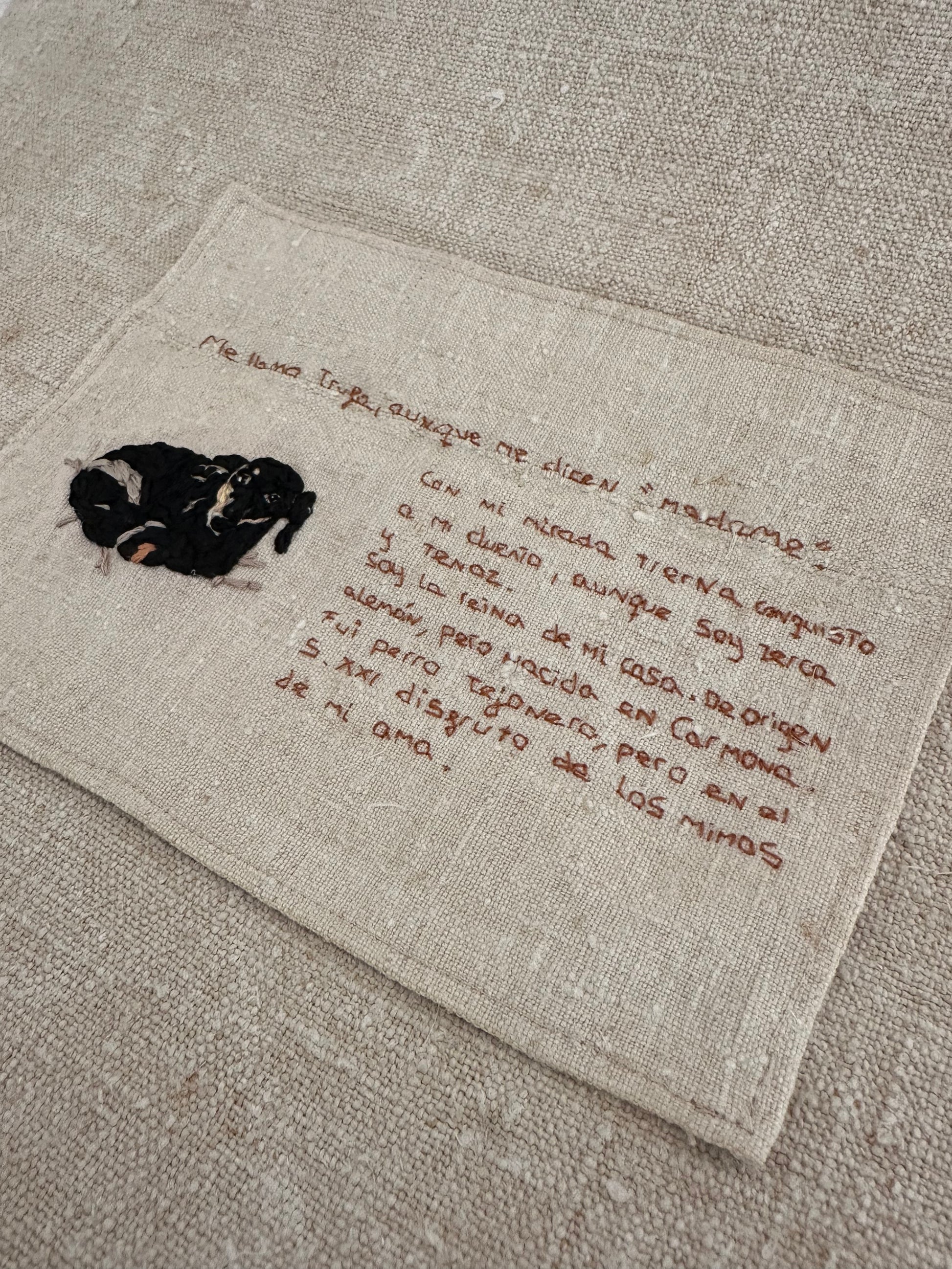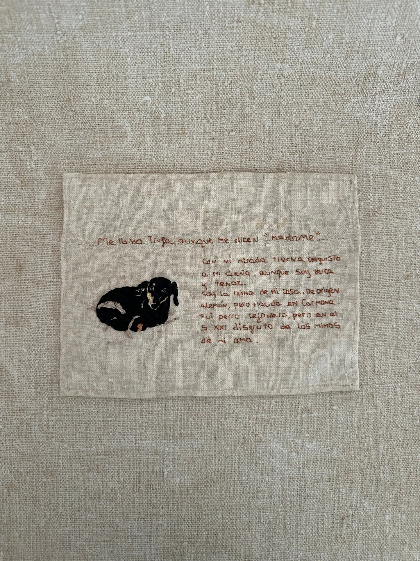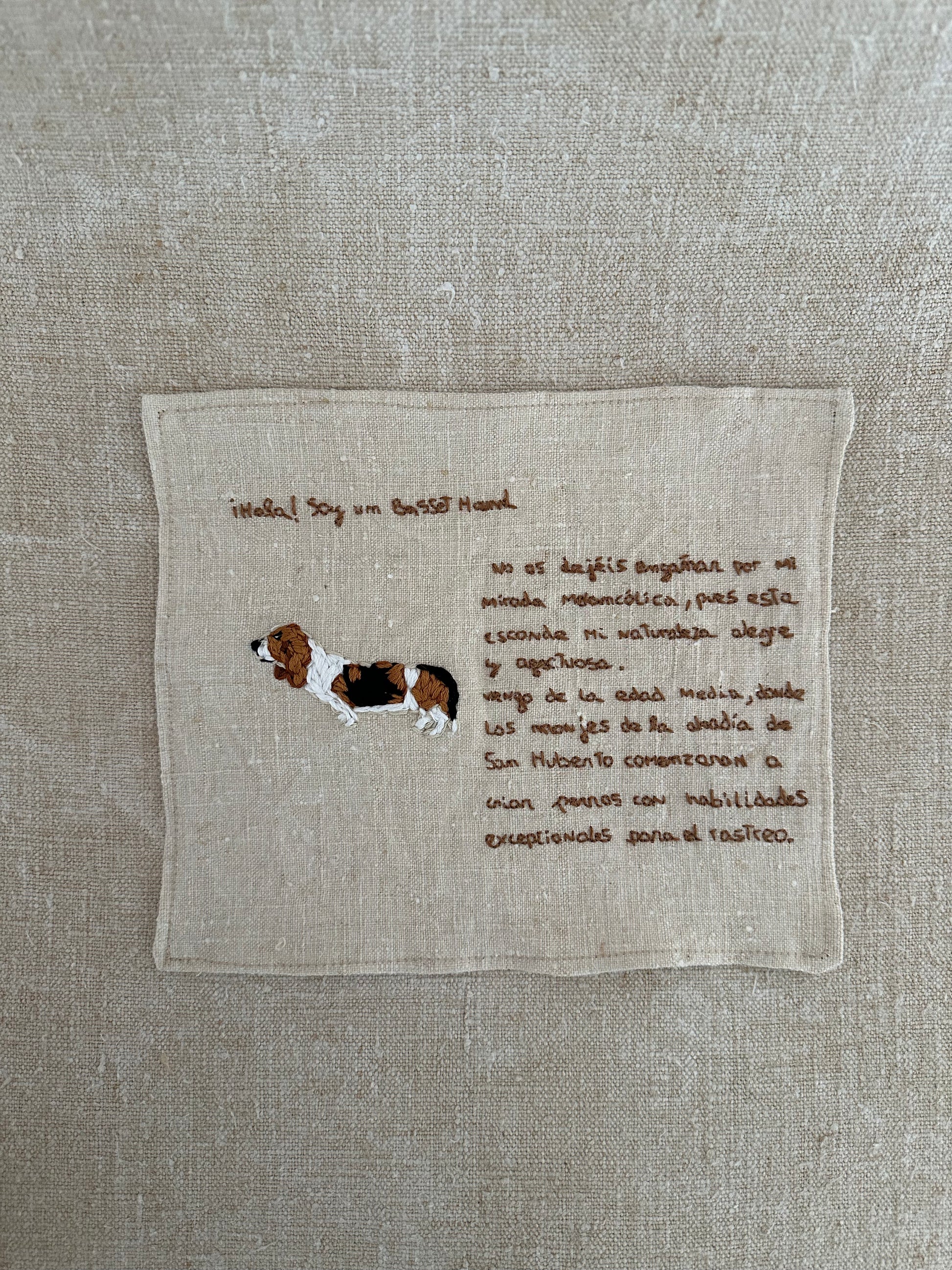 Un recuerdo único y hecho a mano: el bordado de tu mascota acompañado de un breve texto con su historia, sobre lino rígido.